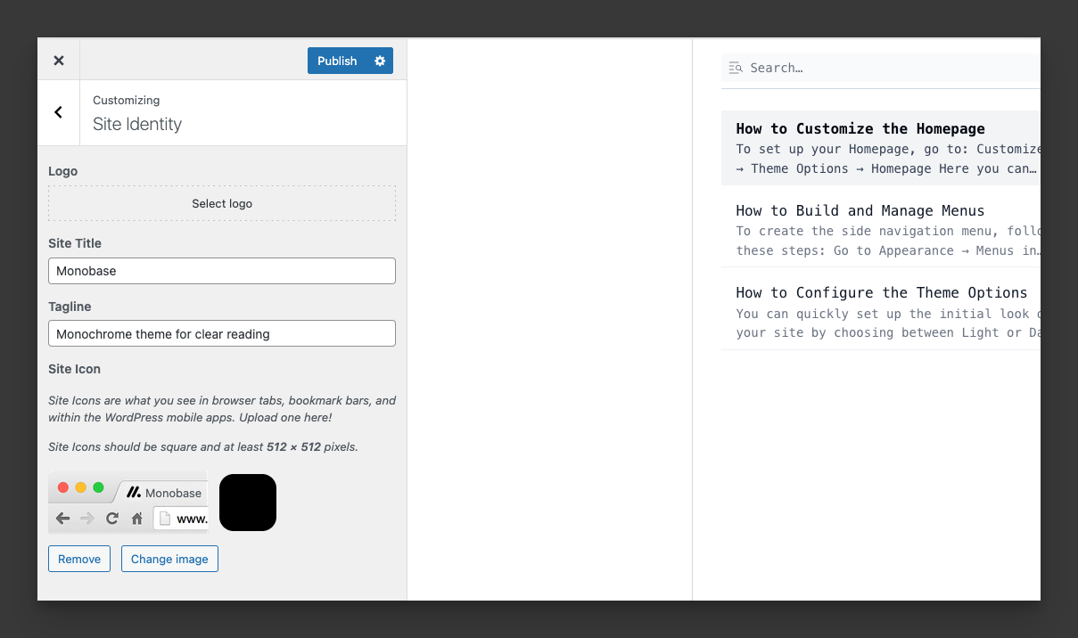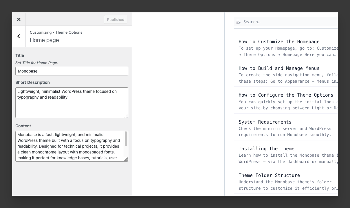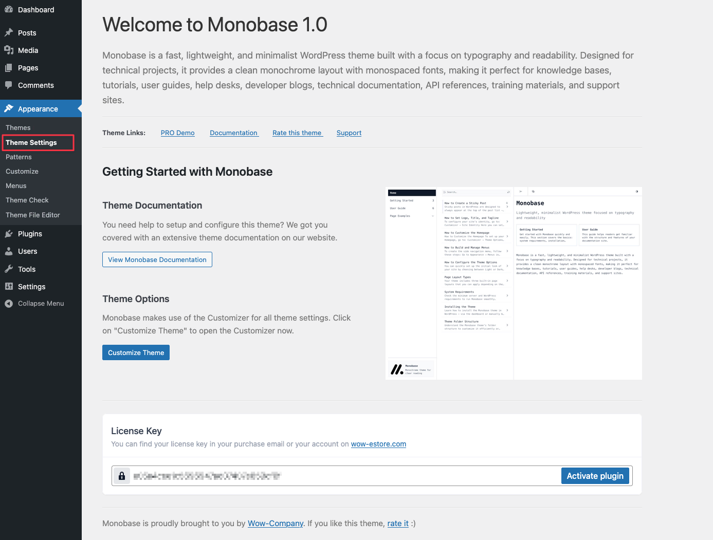 Once activated, you’ll see Monobase as your active theme. You can now:
