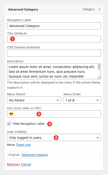 - All new fields appear in the Menu Item Settings when editing a menu under Appearance → Menus.